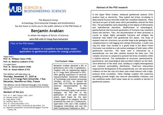 On November 27, 2025, Benjamin Avakian obtained the academic degree of Doctor of Science with the thesis "Fluid circulation in crystalline-hosted shear zone - application to geothermal system for energy production".